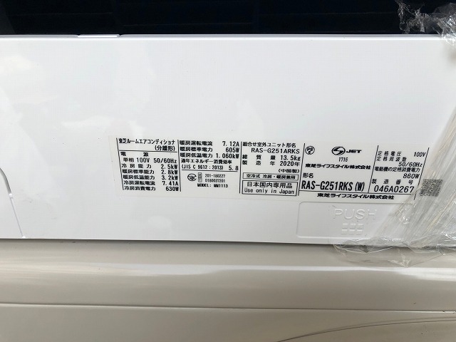 NO.1054 東芝 2020年 RAS-G251RKS 基本工事費込